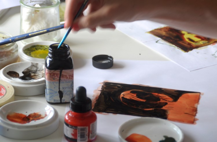 Hum… bonne question ! Je n’y avais jamais trop réfléchi. Le plus souvent, je dirais que c’est l’image qui vient en premier. Un petit dessin, ou une grande peinture, me donne parfois envie de partir sur l’élaboration d’un projet. Puis viennent les mots. Il y a encore quelques années ce n’était pas du tout naturel d’écrire mes intentions, mes idées … mais avec le début de la vie professionnelle, on m’a demandé de justifier (dans des dossiers par exemple) ce que je voulais faire et j’ai pris plaisir écrire. Aujourd’hui, même pour une peinture il m’arrive d’écrire des intentions. Mais j’essaye de ne pas trop décomposer mon processus de création et de laisser les étapes venir de façon instinctive.