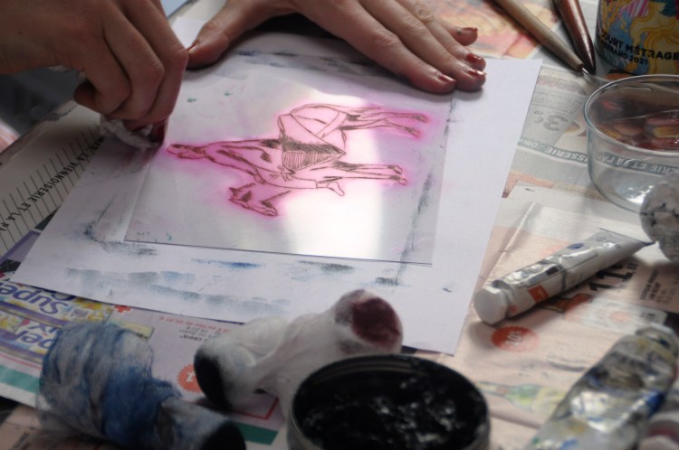 Toutes les étapes de production d’un film ont beau être très différentes (écriture, intentions, recherches, animatique …) j’ai fini par réaliser que le projet dois être figé pour avancer … Du coup, passée l’excitation de la 1ère année à porter le bébé, la lassitude prend parfois le dessus. Participer au workshop de Gianluigi Toccafondo – à l’abbaye de Fontevraud- m’avait fait un bien fou et je me suis dit que je devais faire davantage de « bulles créatives », que ce serait salvateur pour ma santé mentale et pour le court. Donc merci Justine pour cette résidence. Elle m’a permise de peindre sans objectif, sans pression, et avec Chaussette haha !