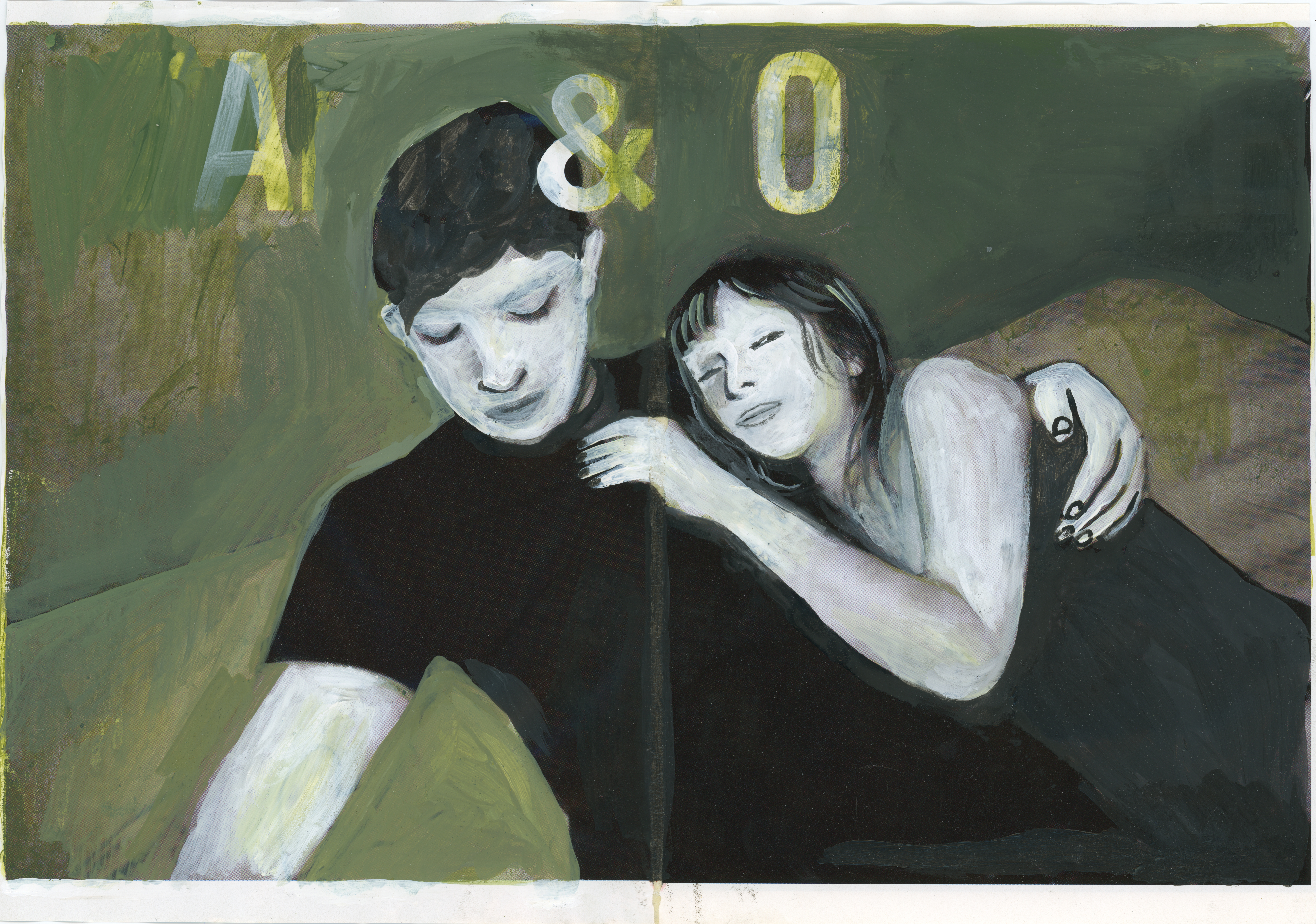 Plus sérieusement, j’ai ressenti le besoin de sortir du « format » dans lequel j’évoluais. J’avais toujours dessiné sur de petits formats, max A4, et j’ai eu envie d’agrandir le support. J’avais retrouvé dans mes affaires une grande affiche de cinéma. Je l’ai retournée et j’ai peint derrière sur cet horrible papier glacé. La tension que j’ai éprouvée en réalisant cette peinture m’a plu et j’ai voulu en faire d’autres. Le très grand format impose aussi de bouger autour de la feuille, de se lever pour prendre du recul, on est plus mobile. Par la grandeur je me sens aussi moins « maître » de ce que je fais et je dois davantage « accepter » le résultat que quand je travaille sur petit format – où j’ai la sensation de tout maîtriser.