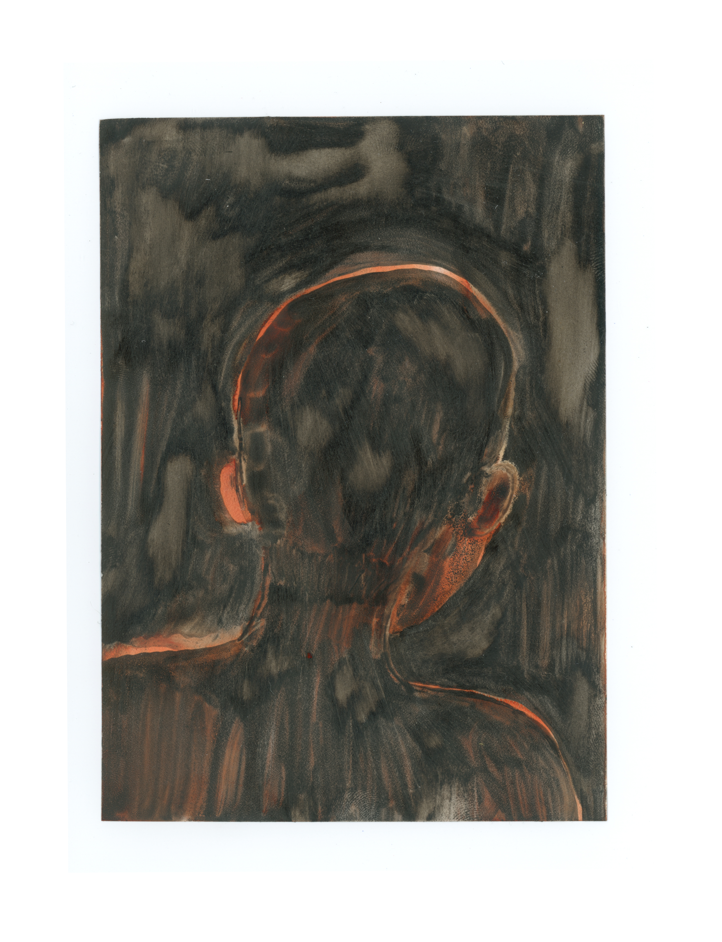 La technique du lavis est allée de paire avec le format, dans un soucis technique et budgétaire. Et il y a le plaisir de voir ces grandes flaques de peinture sécher, marquer des strates, se diluer dans une autre. Mais ce que j’aime le plus dans le grand format, c’est la sensation de se faire dominer par le visuel une fois accroché. On peut se retrouver avec un personnage à échelle 1, un oeil qui fait la taille de notre tête,… et personnellement, je trouve ça très immergeant. Maintenant, je rêverais d’une grande salle de murs blancs pour les accrocher et voir ce que toutes ces peintures donnent dans l’ensemble de l’espace. Oui bon pour pas tourner autour du pot, j’aimerais faire une expo !