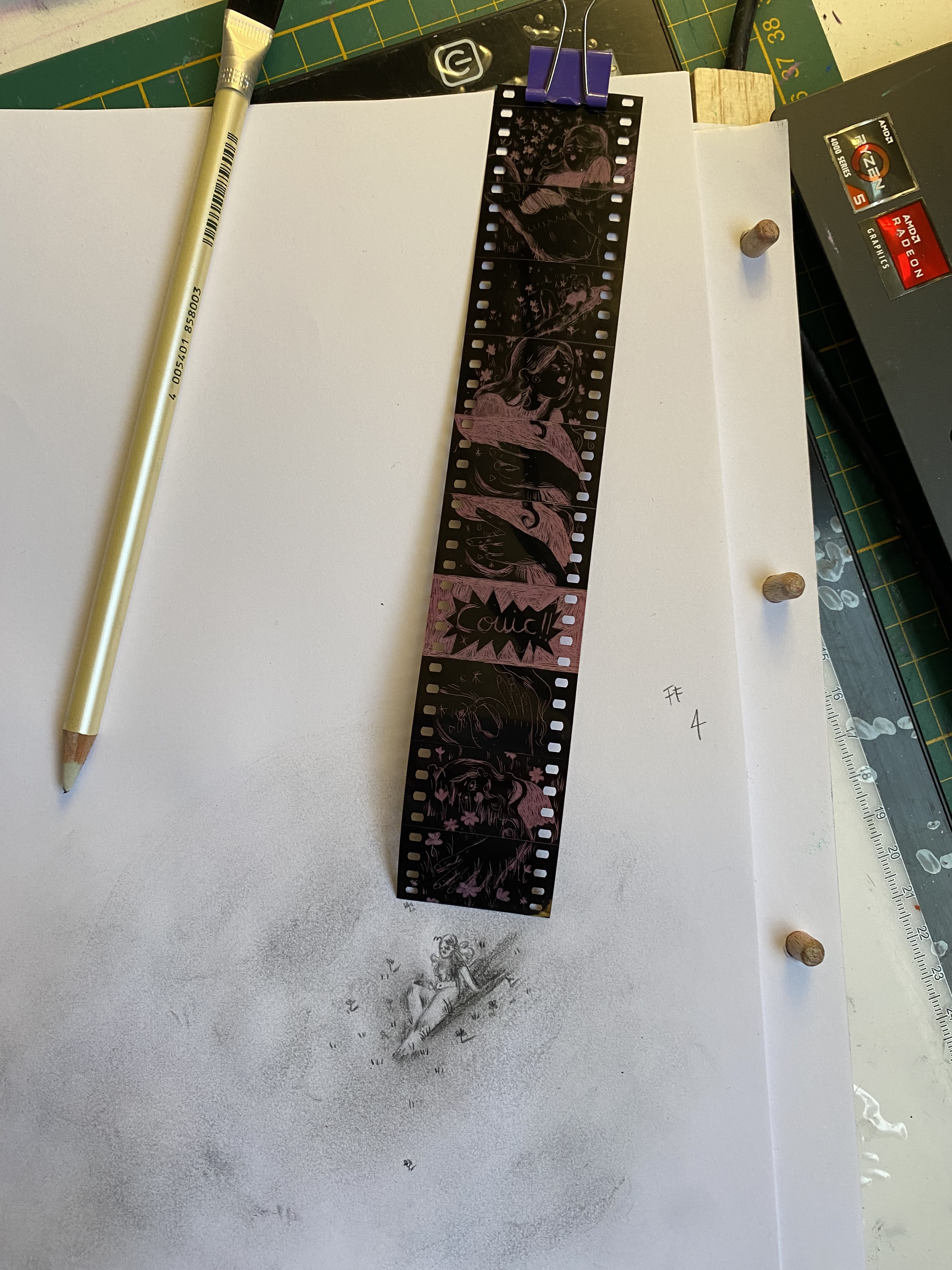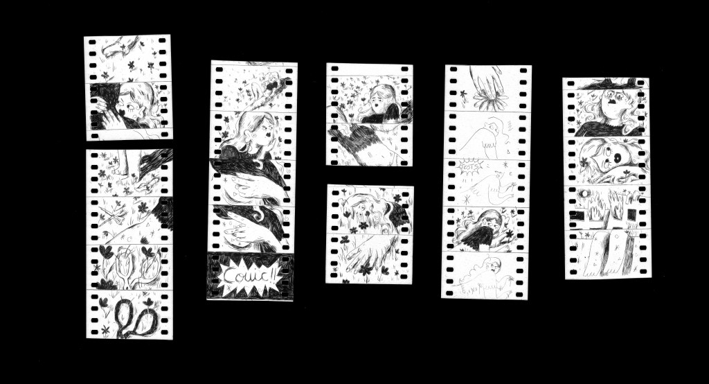 J’avais des envies de cadrages, de rythmes et de thèmes que je voulais creuser de façon un peu éparpillée. Mon but était surtout de cibler des techniques, des matières qui pourraient coller avec les thèmes que je voulais explorer : le corps, l’intimité, la colère, une sorte de violence dans le fait d’être face à soi. Peu à peu, à force de dessiner des cadrages dans la pellicule, des plans se sont succédé naturellement construisant un mini récit.