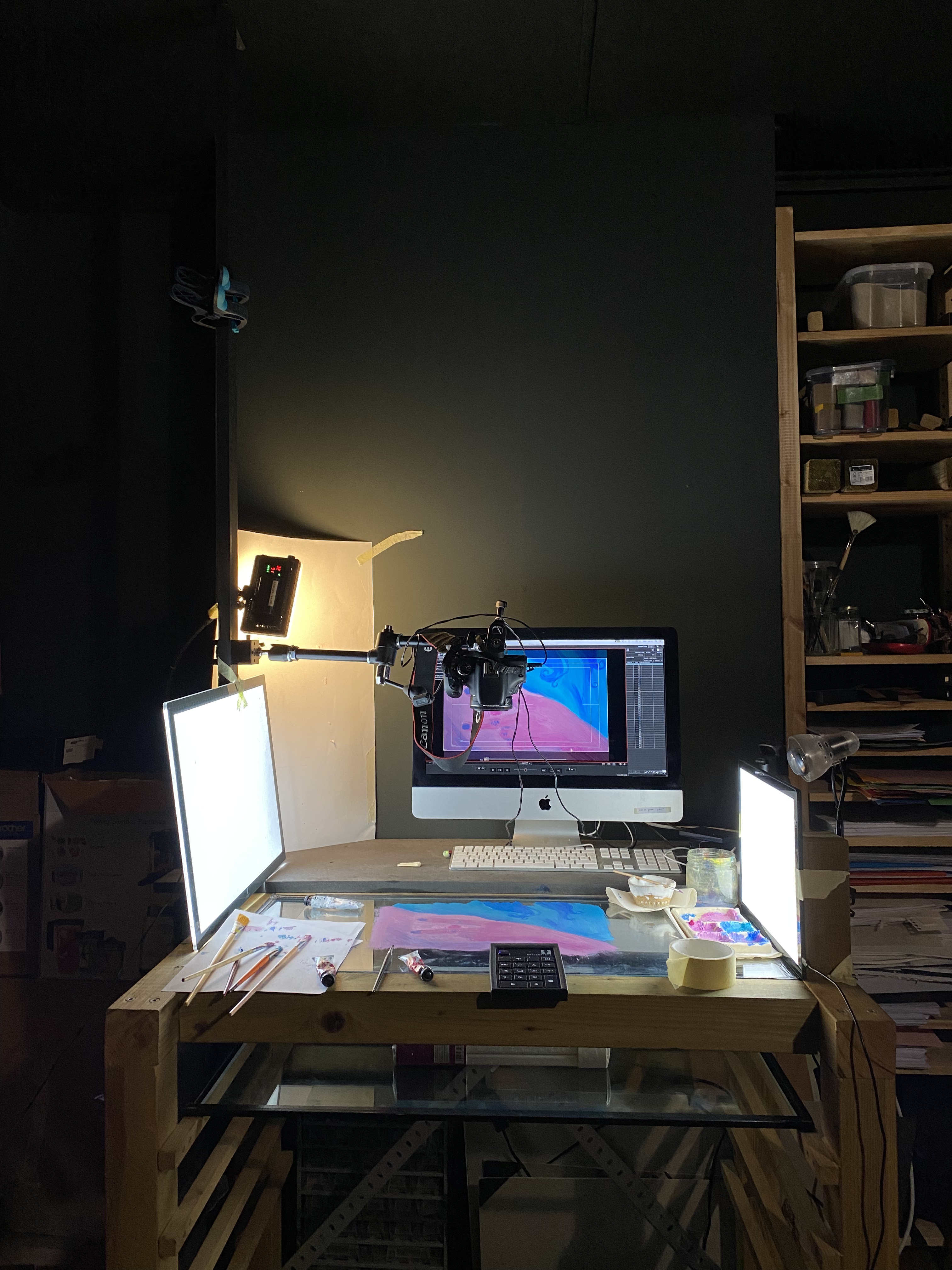 J’ai horreur de devoir redessiner la même chose de A à Z, c’est vite fatiguant (mais qu’est ce que je fais en animation?). Je ne retrouve pas ça dans la peinture à l’huile ! J’ai l’impression de faire évoluer un seul et même dessin pendant toute la durée de l’animation et c’est très stimulant, je ne m’ennuie pas. La nature éphémère de la peinture à l’huile sur verre, qui ne laisse pas de traces physiques à la fin de la séance mais seulement un rendu animé sur l’ordinateur, me plaît. Parfois je me sens enfermée dans la trace qu’un dessin sur papier peut laisser, avec l’huile sur verre j’ai un grand sentiment de liberté.