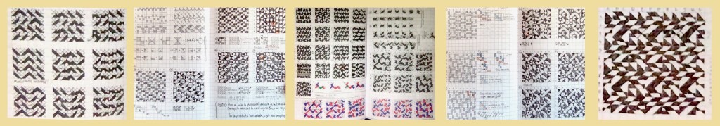Par un carnet. Je venais de sortir d’une production assez éprouvante, et c’est en cherchant à rétablir le calme qu’assez instinctivement je me suis mise à colorier des petits carrés dans les pages d’un carnet. Ça a commencé très simplement : je choisissais un format de grille ( 6×6 , 10×10, 12×12 …) , je décidais d’une règle arbitraire (un carré sur deux, trois carrés puis rien …), et je laissais se générer un motif. Puis je passais à la grille suivante en modifiant un petit aspect de la règle à chaque fois, pour voir comment le motif évoluait. Avec le temps les carrés se sont subdivisés en 4, puis eux-mêmes coupés en diagonales … Les grilles se sont complexifiées au point de passer d’un travail de pixel à un travail de pavage.