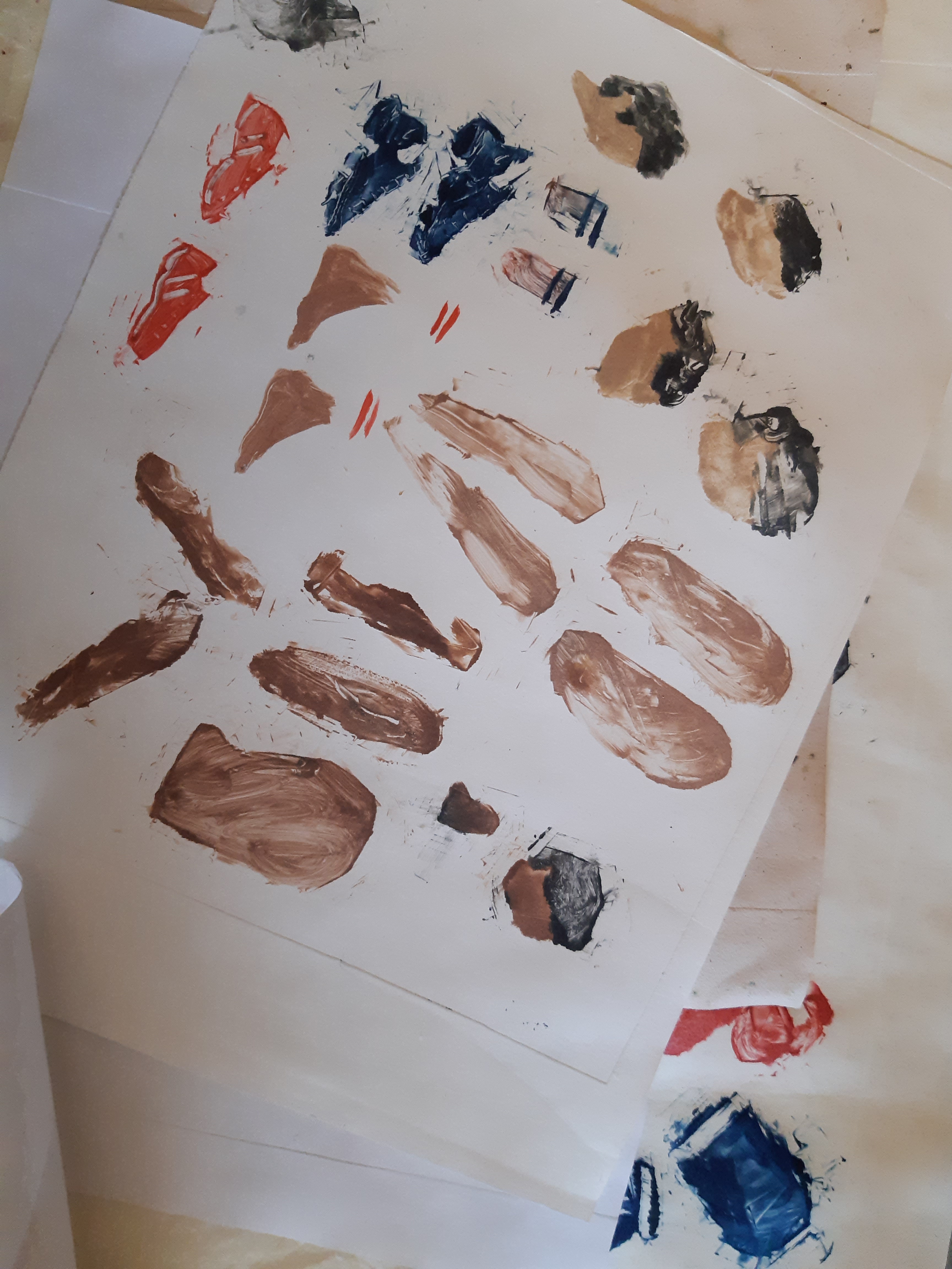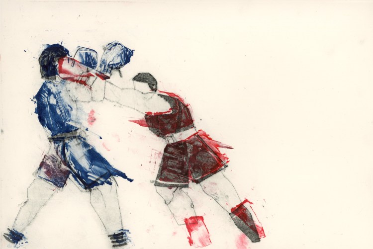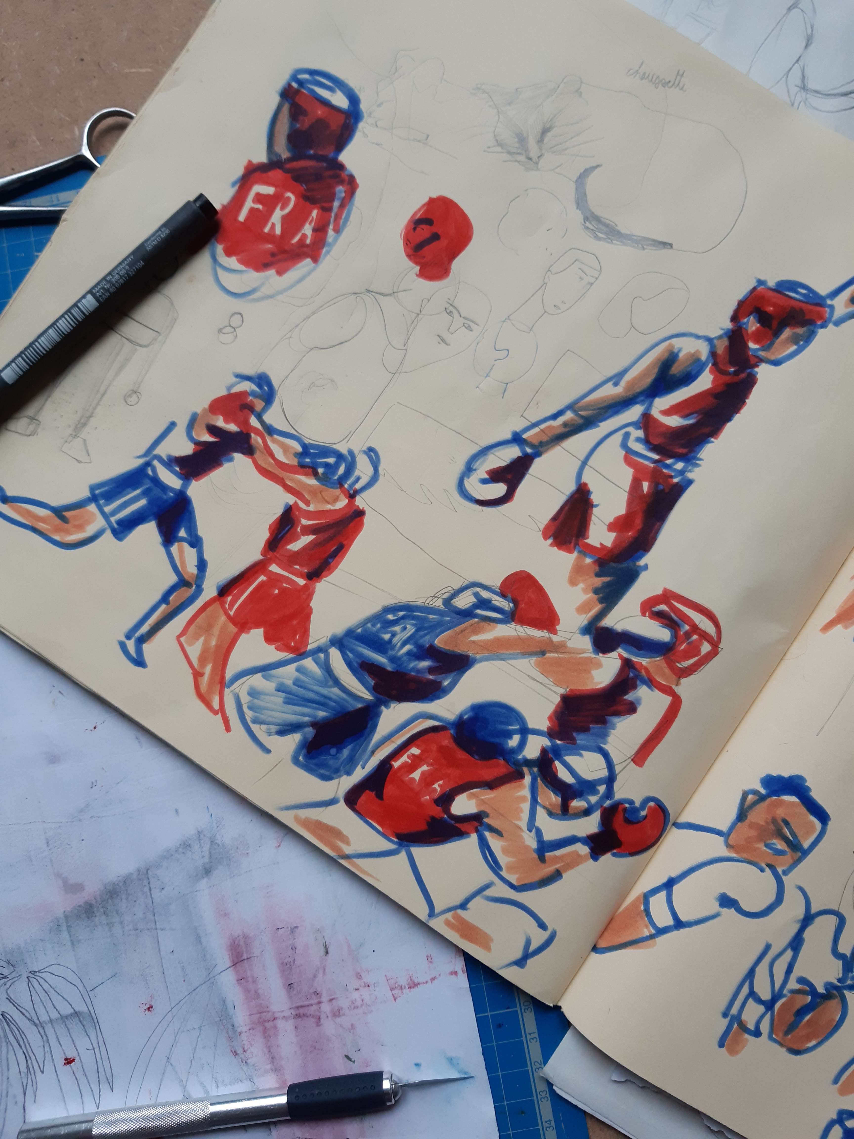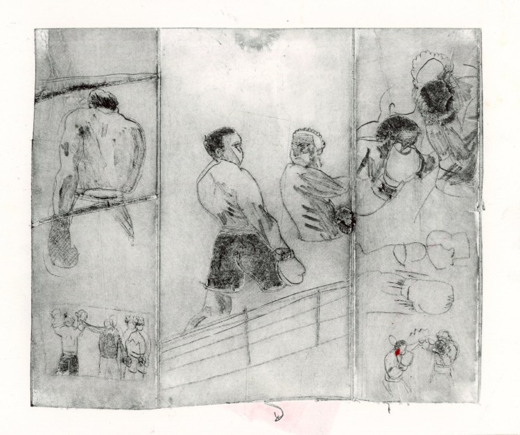 Oui. De base je voulais venir à la Jachère pour mettre en image un travail initié l’année dernière sur la maison d’enfance de mon père. Mais étant donné que ça a aussi été mon sujet de mémoire cette année, j’ai vite eu la sensation de tourner en rond, j’avais envie de faire autre chose. Plusieurs fois, pendant les deux semaines, je me suis retrouvée à court d’inspiration. Comme j’avais amené Antigone de Jean Anouilh pour le relire, j’en ai utilisé des extraits comme béquilles pour faire des monotypes et gravures. Toutefois, au bout d’un moment je me suis sentie un peu limitée. La thématique de la boxe est arrivée une fois sur place, je n’ai aucun projet lié à la boxe j’aime juste dessiner ce sport. J’ai fait ça pour m’amuser, et, produire des images sans but précis m’a permis de me lâcher et au final de faire naître une envie d’anim.