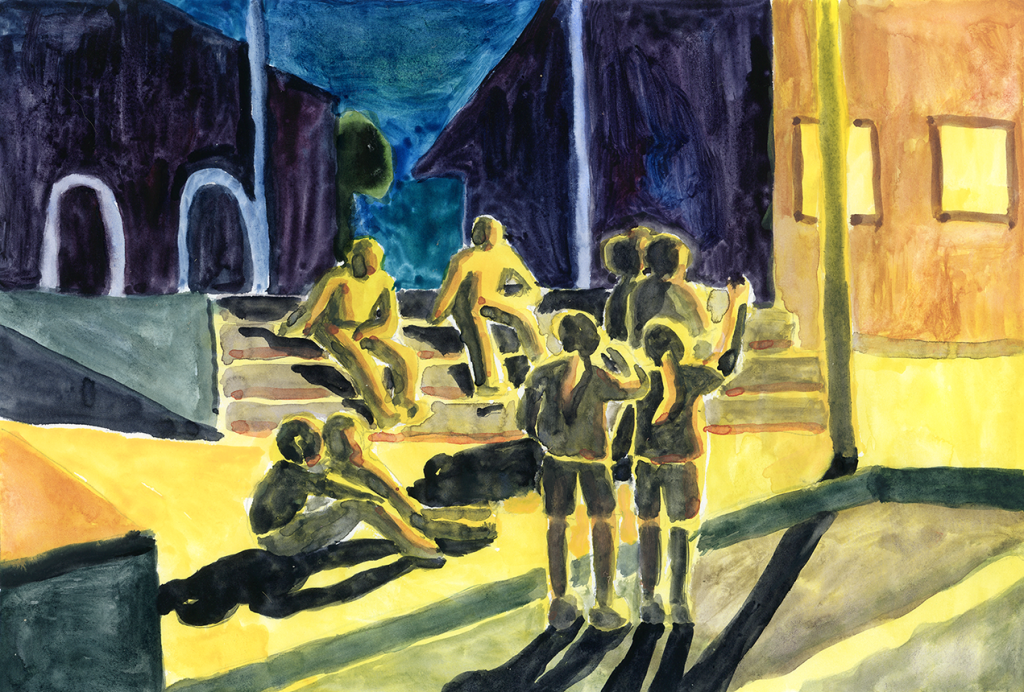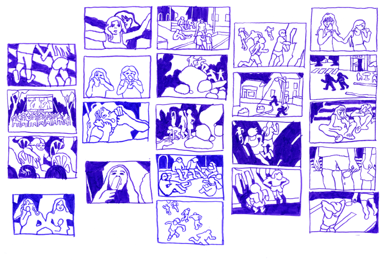 Léna : De mon côté je réfléchis beaucoup en dessinant. Quand je dois mettre en scène des personnages, je fouille dans mes carnets, je compose plein de petits cadrages sans vraiment savoir ce que je veux raconter encore. Souvent je dessine en boucle, un décor, une scène ou une situation. Pendant la résidence par exemple, je bloquais sur un motif : des enfants qui courent dans tous les sens. Ce genre d’idée redondante peut être un bon point de départ pour écrire un film un peu plus expérimental, mais pour créer des personnages et une narration plus linéaire c’était trop vague. Heureusement, comme on est deux à faire ce film, on est obligées de discuter tout le temps de ce qu’on fait. Pour moi c’était plus facile d’écrire après nos échanges. Par exemple, pour les premières ébauches du scénario, on se partageait la narration, on écrivait un peu chacune de notre côté, on mettait en commun puis on retravaillait sur la partie de l’autre. Ça donnait toujours l’impression de faire quelque chose de nouveau.