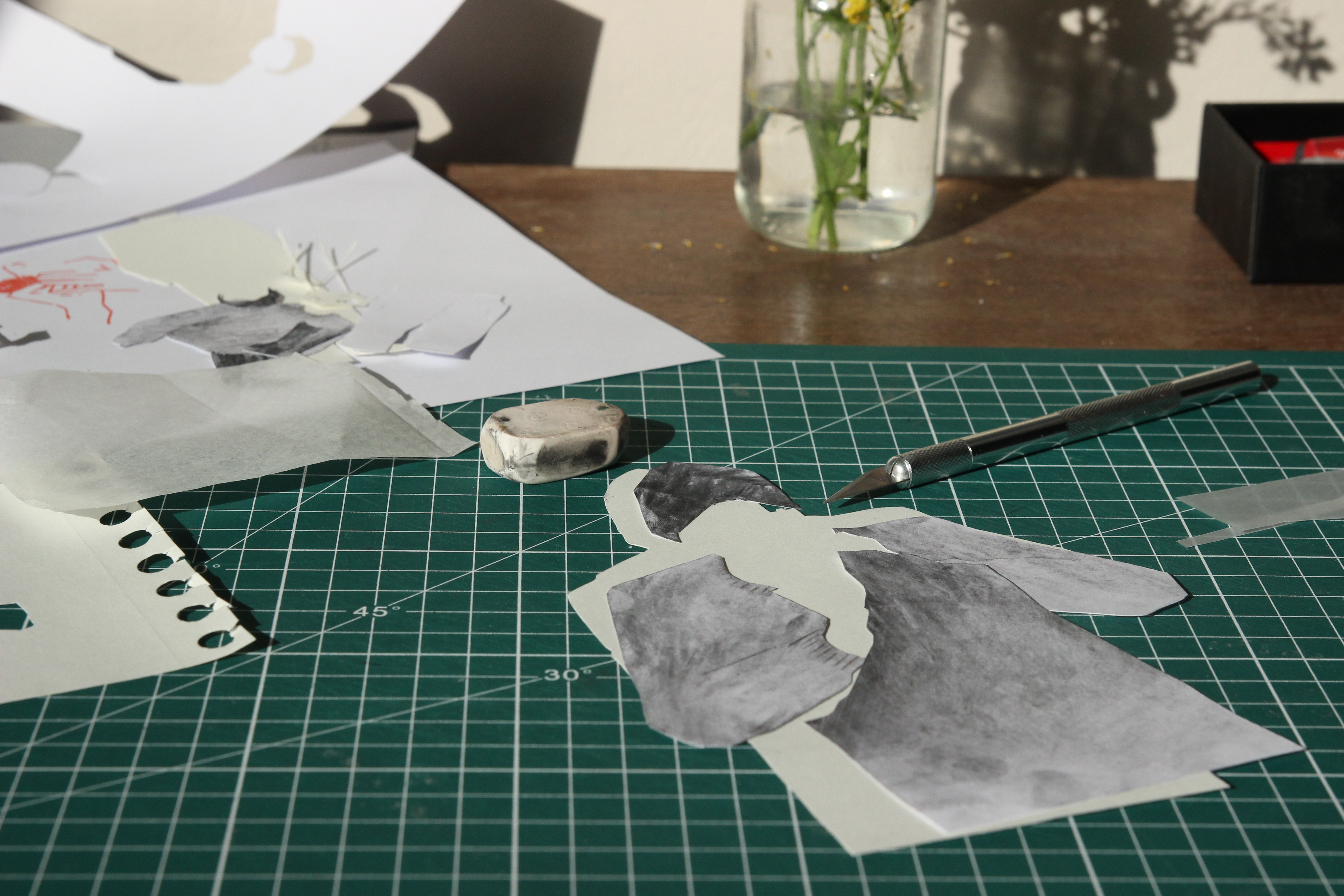 Je crois que mon principal étonnement pendant la Jachère fut de découvrir que des images que j’avais prises pour des dessins aux textures retravaillées à l’ordinateur étaient en réalité des photos de papiers et calques découpés sans aucune retouche. Et c’est ce qui m’a le plus fasciné, que l’on arrive à créer des images aux allures magiques avec des matériaux pourtant très simples et concrets.